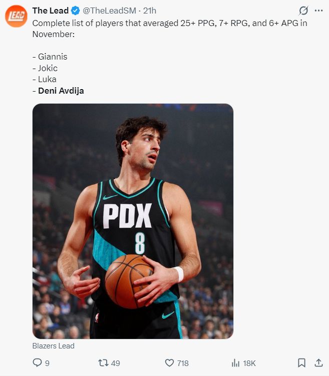 5.本赛季只有扬尼斯、约基奇、东契奇、阿夫迪亚场均达成25+7+6;