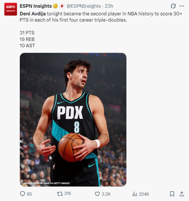 4.阿夫迪亚是开拓者队史首位两次30+15+10三双的球员;